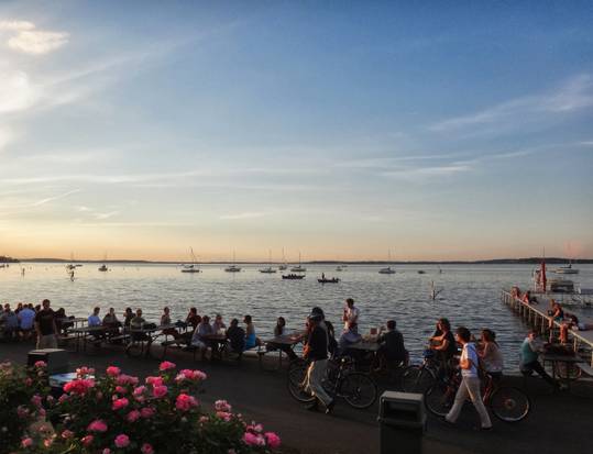 At the hour when Texans dash from air-conditioned office to air-conditioned car to air-conditioned home, couples and children are twirling on Memorial Union Terrace?s lakefront promenade. Everybody?s welcome at the University of Wisconsin?s sea of tables circled by bright yellow, orange and green chairs, each graced with a stamped-metal sunburst pattern.